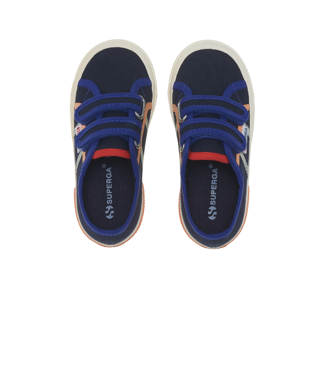 For the little ones who love colourful graphic style, this Superga 2750 for kids features a cotton canvas upper with contrast-coloured piping. The vulcanised rubber sole, strap closure, and side jacquard logo round off the design.